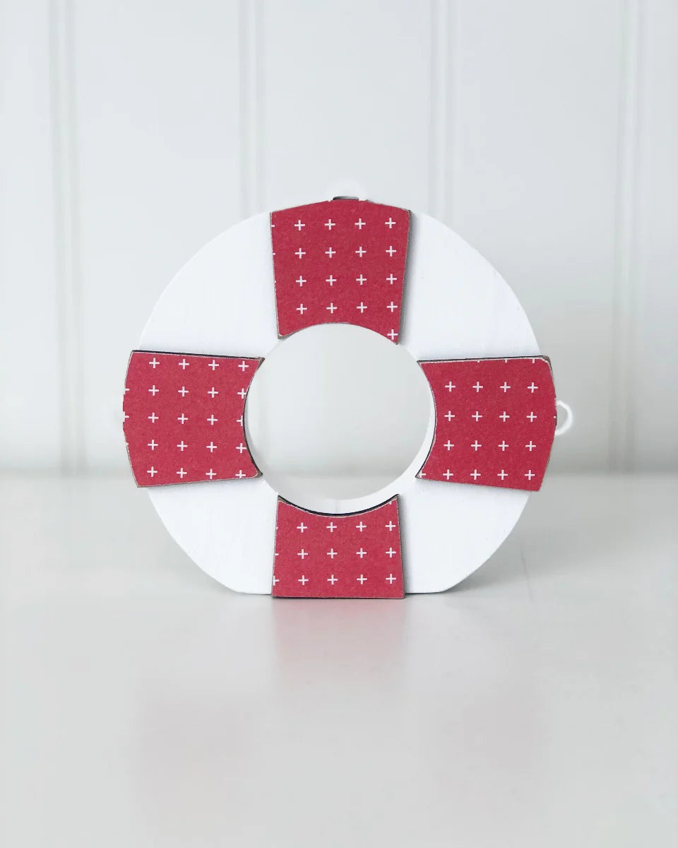 - (1) piece ; wood block ; At the Beach Preserver ; display size = 5” x 4.75” ; use alone or with the "Home" letters