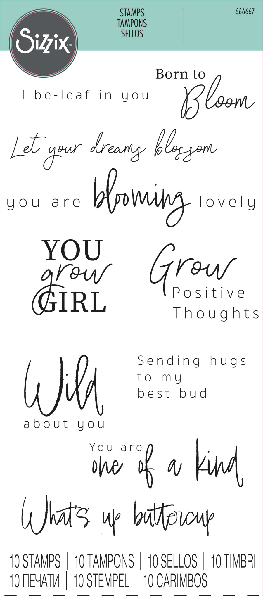 Add uplifting flair to your projects with the Sizzix Born to Bloom Clear Stamps Set. This inspiring 10-piece collection features encouraging phrases like “Born to bloom” and “You grow girl,” along with other charming sentiments that bring positivity and charm to any creation. Perfect for cards, scrapbook layouts, journals, and more, these stamps are a must-have for crafters who love adding heartfelt touches.