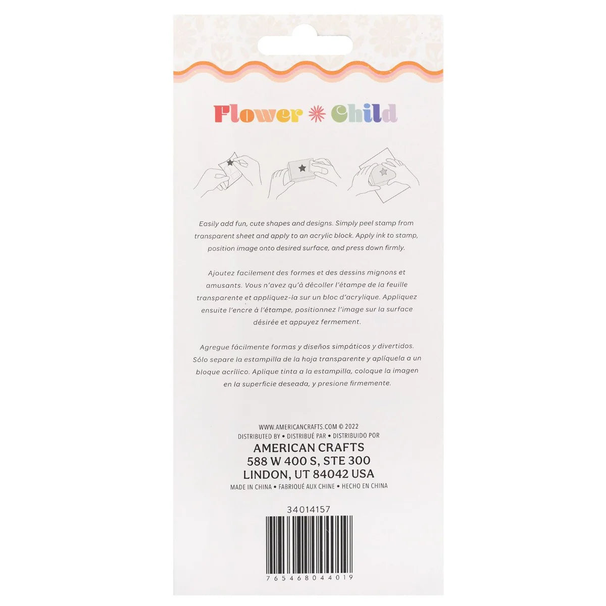 Order the American Crafts' Flower Child Stamps from the CraftDirect.com store online. Re-usable stamps should be properly cared for so that you can use them for years and years. Clean after use, and press with a mount for best results. Step into a world of fun and color with Flower Child Collection by Jen Hadfield, where you'll find yourself in a floral sundress and a groovy vibe. This stamp set offers a versatile range of designs, including a roller skate, flowers, the words I (heart) you, and Good Vibes. Designed to stick to acrylic blocks, these can be used with various crafting materials, such as inks, markers, and embossing powders, which are not included and must be purchased separately.