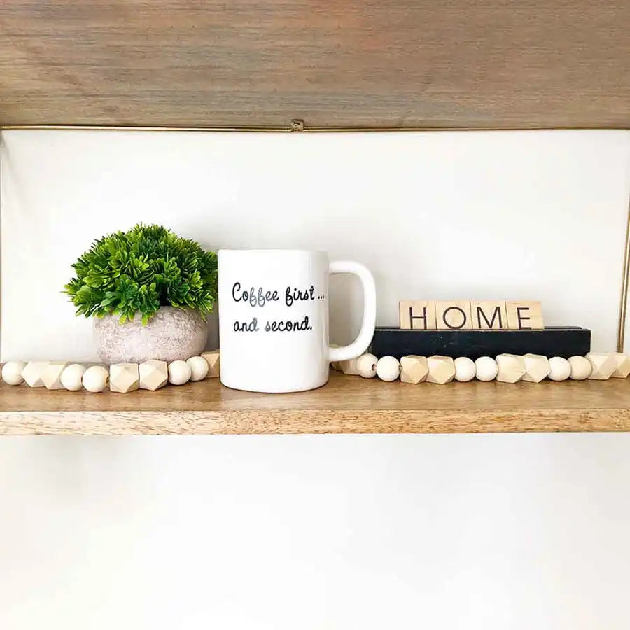 Save now, enjoy the Foundations Decor Coffee First... and second Ceramic Mug from the Tabletop Decor series at CraftDirect.com. This ceramic mug is perfect to use as a stand-alone decoration or matching with other home decor from the Tabletop Decor series (sold separately). With durability in mind, this decorative mug is dishwasher safe.