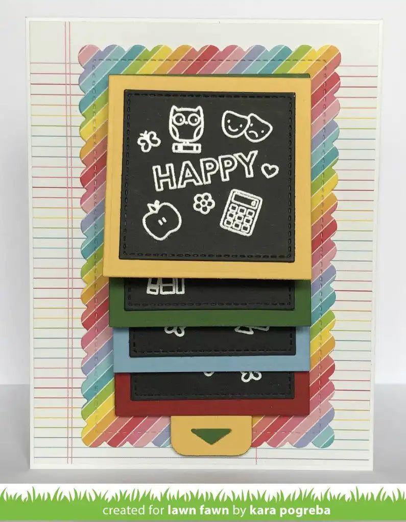 (5) thin dies ; custom craft dies ; stitched scalloped rectangle: 5" x 3 1/8" ; stitched rectangle: 4" x 2" ; pull tab: 1" x 7/8"; coordinates with Flippin' Awesome Add-On ; Made with care in the USA!