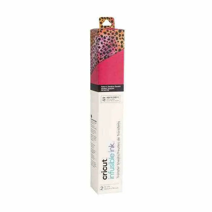 - (2) sheets ; Infusible Ink Transfer Sheet Patterns ; Rainbow Cheetah ; size: 12” x 12” (30.5 cm x 30.5 cm) ; Produces vibrant, pro-quality transfers that last a lifetime ; Requires compatible Infusible Ink blank (sold separately) and Cricut EasyPress 2 or heat press that reaches 400°F (205°C) ; Transferred inks never flake, peel, crack or wrinkle ; Cut designs for T-shirts, coasters, baby bodysuits, tote bags, and more ; Carefully follow instructions at help.cricut.com ; Sheets will be damaged by liquid/moisture. Store in dark, dry place ; Will not work with incompatible base materials ; Water-based, acid-free. Not intended for consumption or to be used on skin. For adult use only ; For Cricut Maker®, Cricut Explore® family machines, and Cricut EasyPress 2